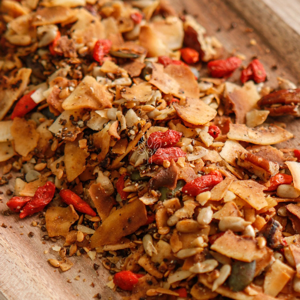A sugar-free blend of grounded pecans, coconut flakes and seeds prepared for those who want a scrumptious, totally natural and low carb granola. The ultimate high fibre crunchy breakfast solution without preservatives, sugar and gluten.