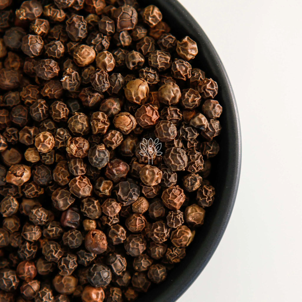 Whole bulk black peppercorns to give you that freshly ground spice.