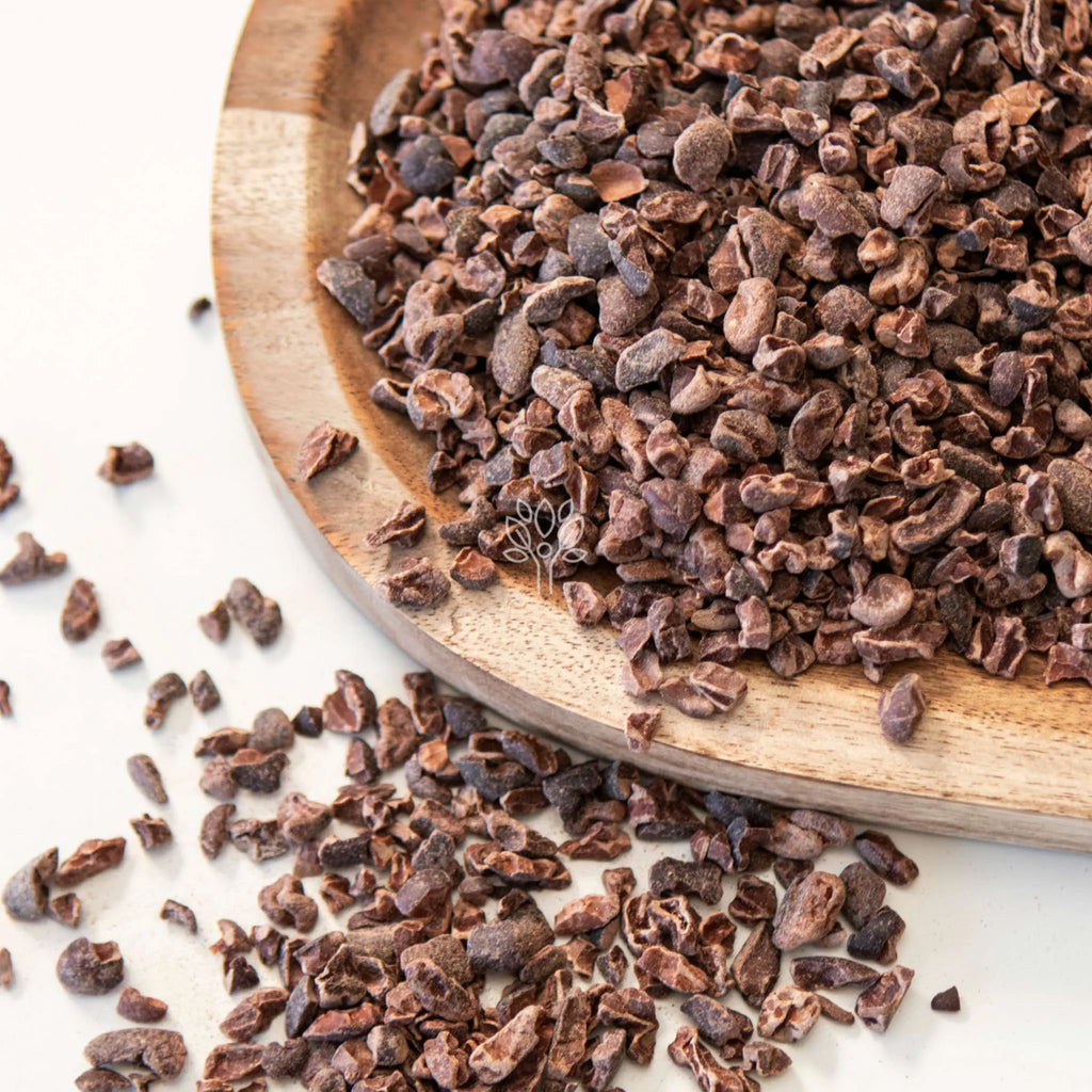 Cacao nibs are crumbled bits of dried cacao beans, which is the same bean used in the production of chocolate.