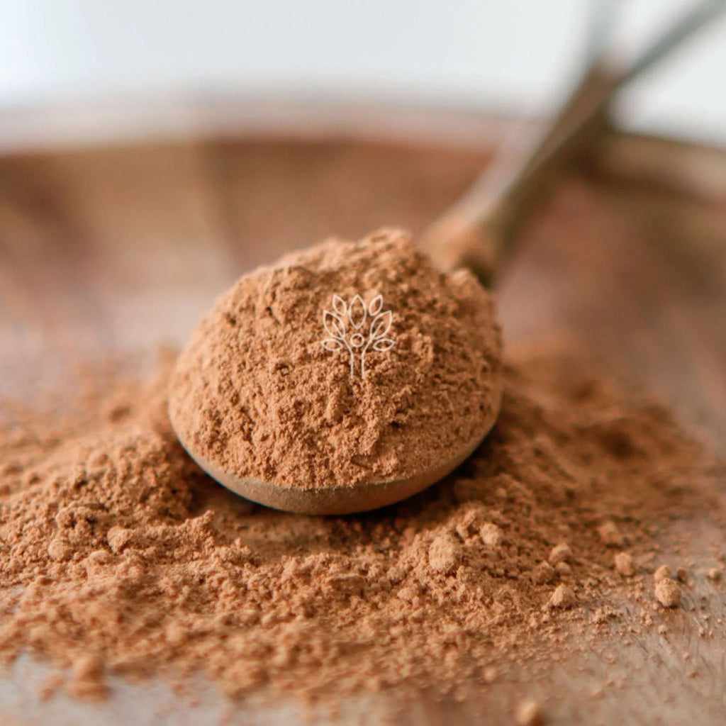 A fine textured powder made from the cocoa bean. It is the main ingredient in chocolate so its easy to imagine that it gives a sweet but deep chocolatey taste when baking cakes, muffins or just serving it as hot coco.