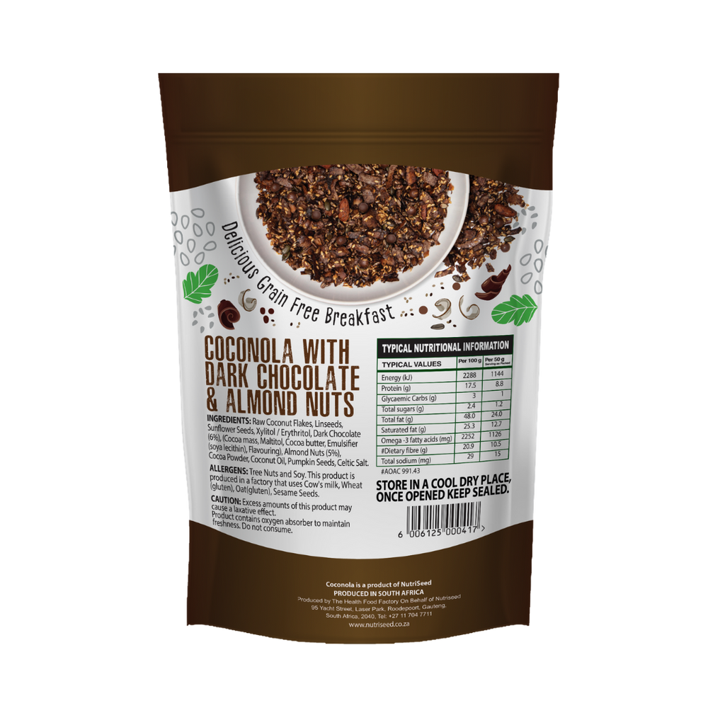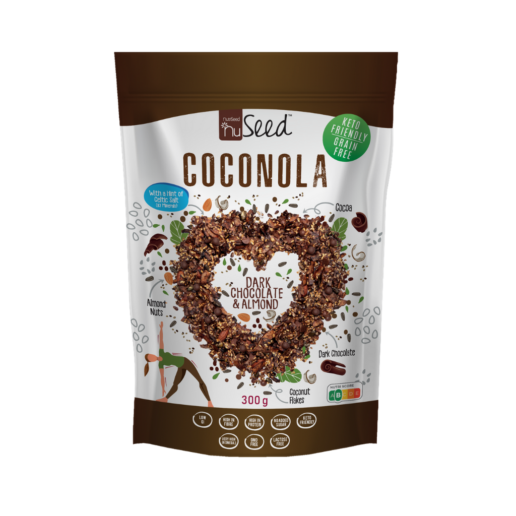 For the chocolate lovers — it’s never too early to satisfy that craving! Coconola Dark Chocolate & Almond is a luxurious blend of roasted coconut flakes, crunchy almonds, and golden linseeds, combined with chia, pumpkin, and sunflower seeds. The richness of premium cocoa and sugar-free chocolate drops adds a touch of decadence, perfectly balanced with a sprinkle of Celtic salt to enhance the natural flavors. Indulge in every spoonful while nourishing your body with essential nutrients. Properties:
