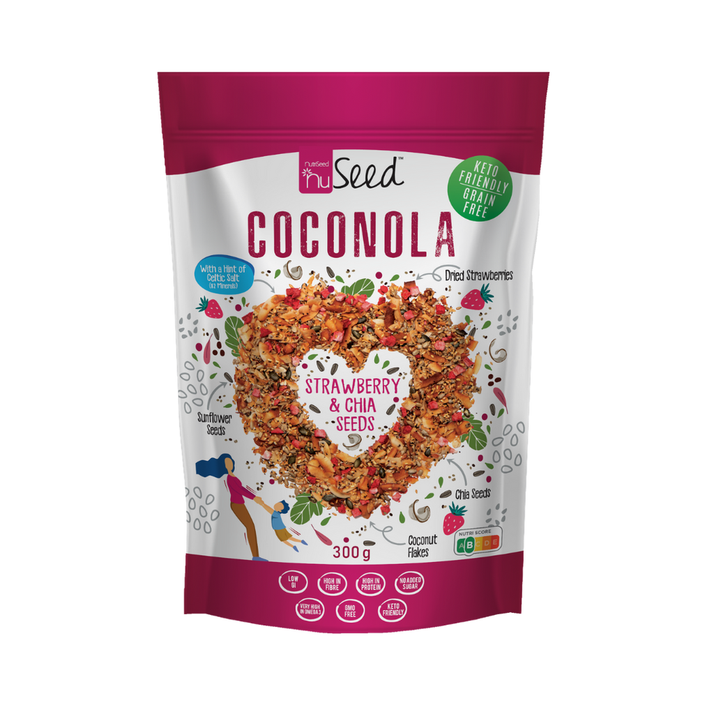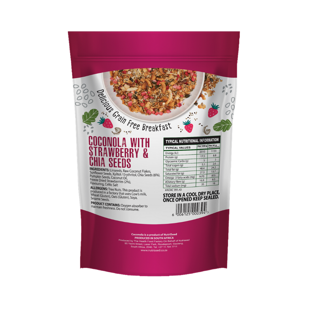 Coconola – Strawberry & Chia Seeds is a delightful, nutrient-packed blend of freeze-dried strawberries, coconut flakes, chia, golden linseeds, pumpkin, and sunflower seeds, roasted to perfection with a balanced touch of sweet, salt, and natural strawberry flavor. This crunchy, wholesome treat is not only a hit with adults but also loved by kids. Infused with Celtic salt, known for its impressive mineral profile, this Coconola delivers a burst of goodness and taste in every bite.